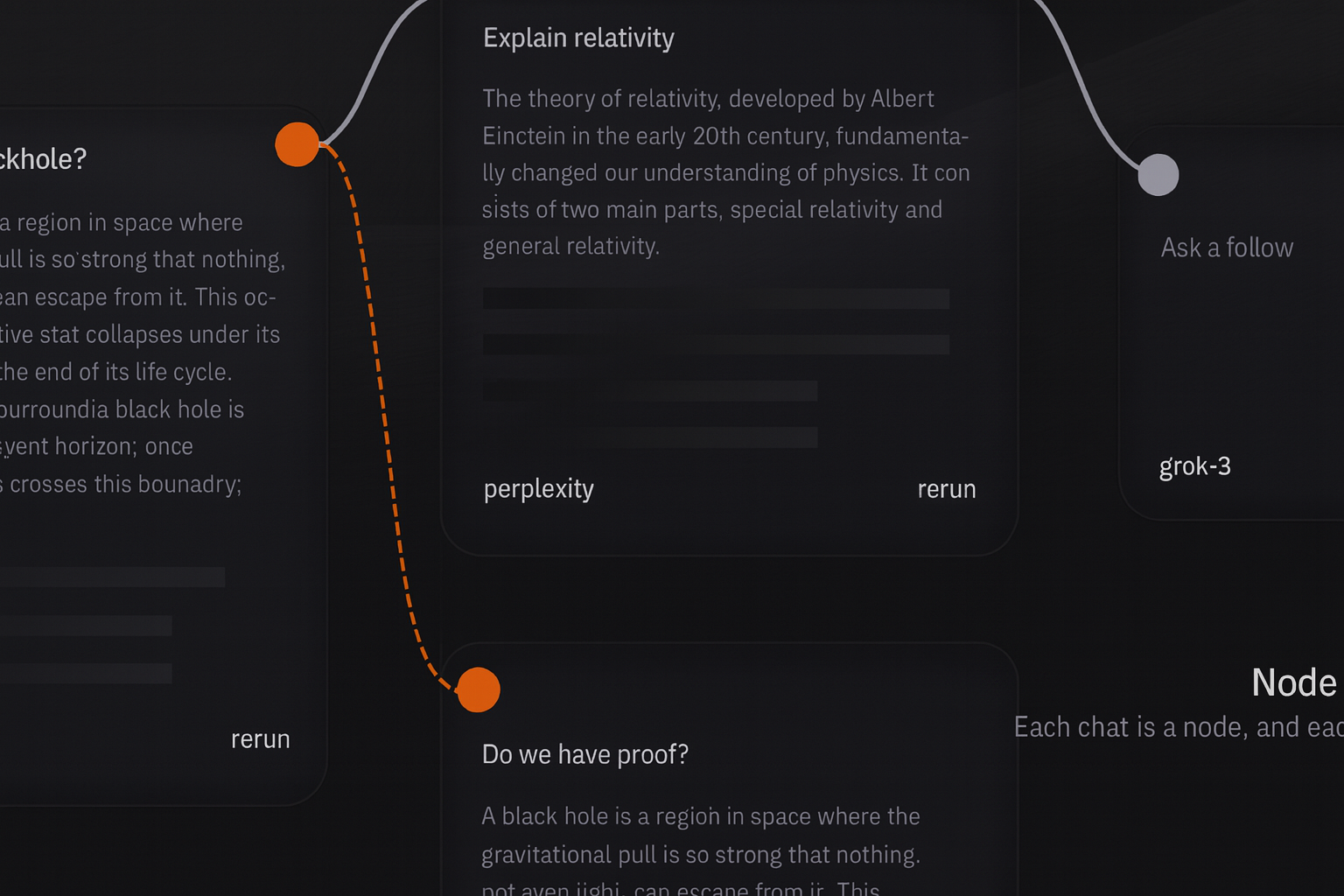 A Grapen.ai é um aplicativo local que roda no seu computador. Cada nó em uma tela é uma conversa com a IA. Você pode criar conversas ramificadas para compartilhar contexto.